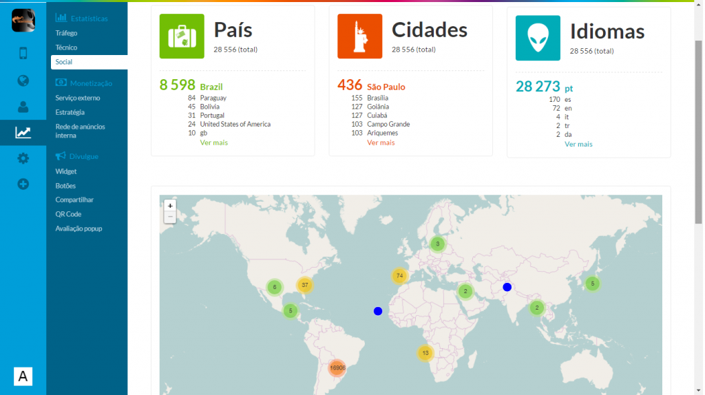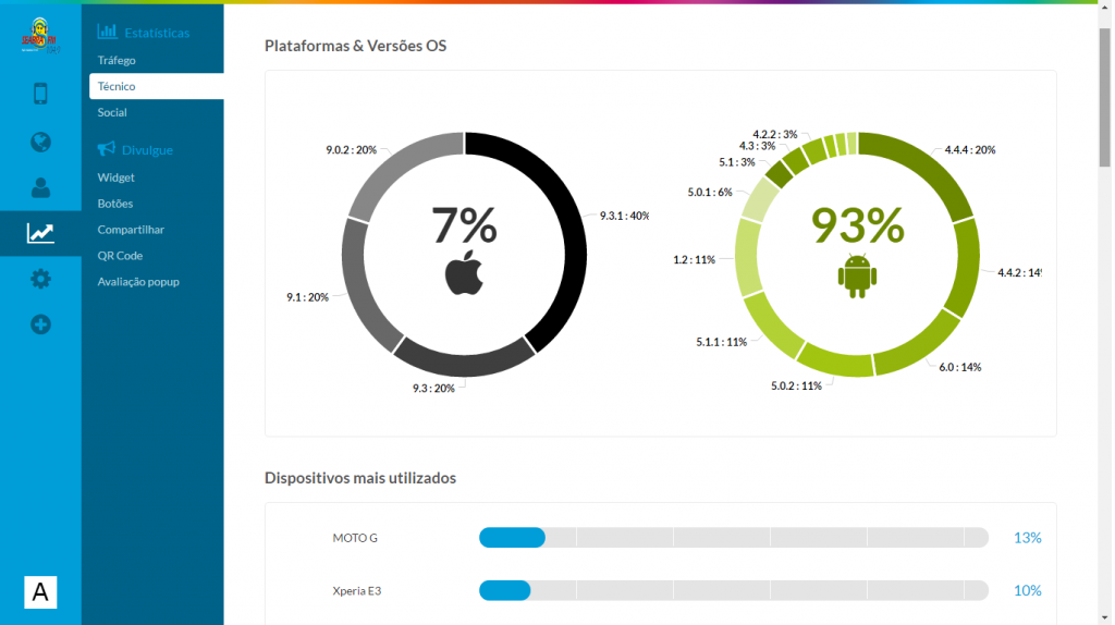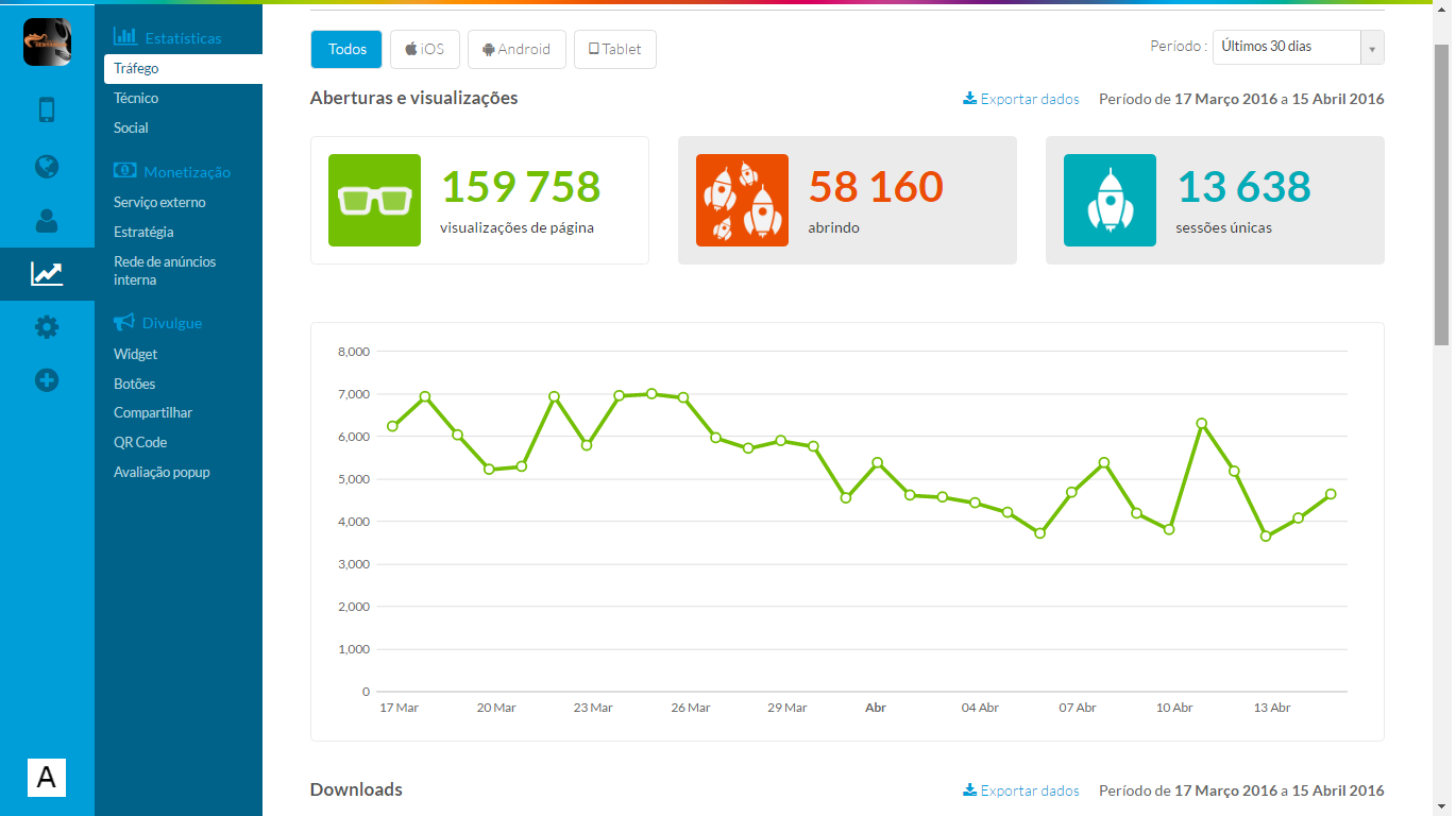 - Estatísticas de downloads, acessos e tempo de uso dos aplicativos com ferramenta Web em tempo real.